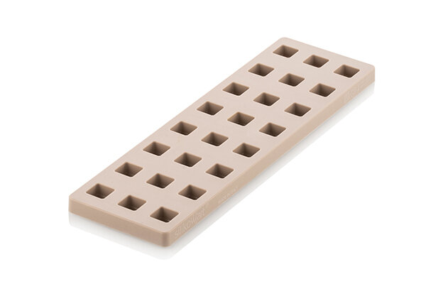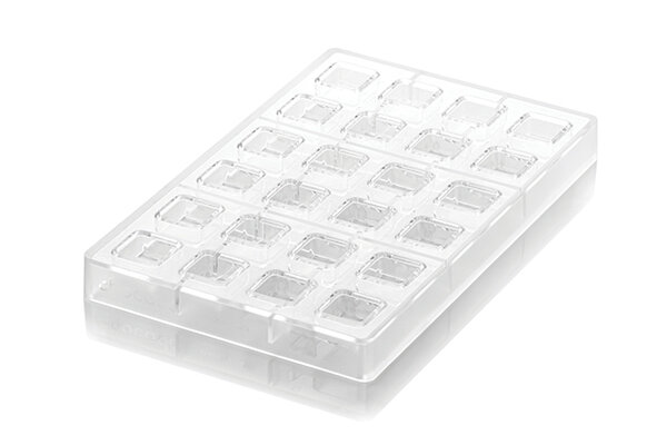 Profesionální polykarbonátová sada na pralinky Quadro. Rozměry: 24x8,9ml 1,5x2,5x2,5 cm.