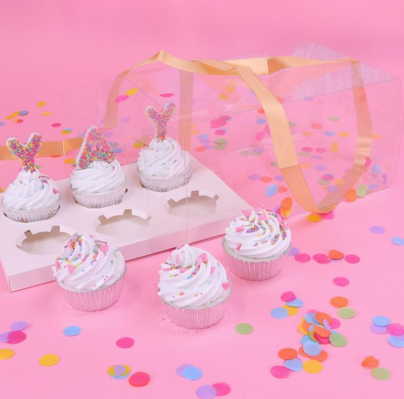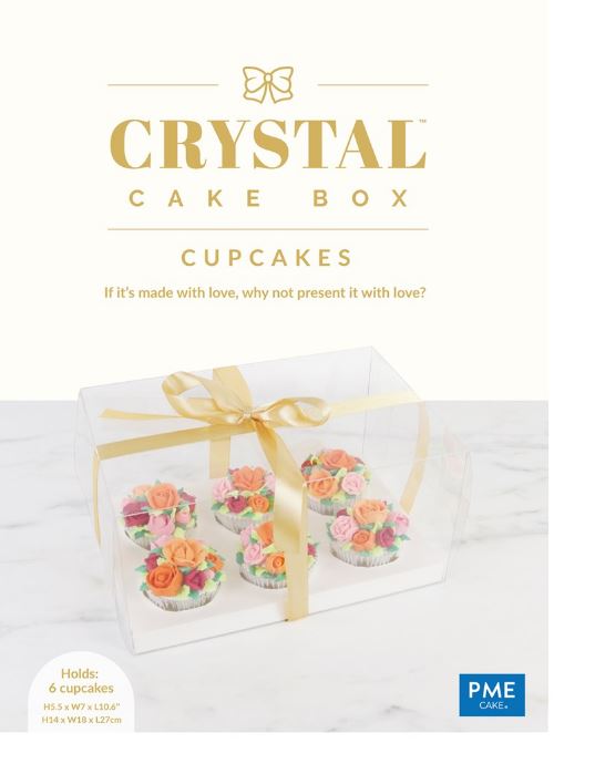 Tyto krásné průhledné krabičky na cupcakes od PME jsou perfektním způsobem, jak prezentovat vaše cupcaky. Je to křišťálově čistá krabička na košíčky vyrobená z PET plastu pro všestrannou viditelnost. Krabičky jsou jednotlivě balené s pevnou vložkou a zlatou saténovou stuhou. Při běžném používání lze box používat znovu a znovu. Rozměr T-boxu: 14 x 18 x 27 cm. Vhodné na 6 cupcaků.