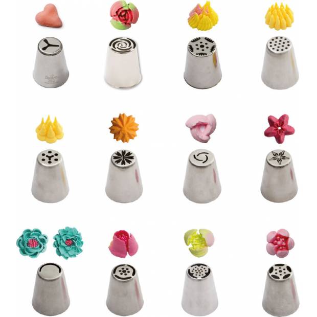 Praktické ruské koncovky na zdobení dortů a moučníků vyrobené z nerezové oceli. Vytvářet můžete květiny, srdíčka, hvězdičky a další 3D dekorace na dorty, moučníky, poháry či cupcakes. Koncovky jsou plně omyvatelné a snadno je uskladníte. Baleny jsou do stylové plastové krabičky.