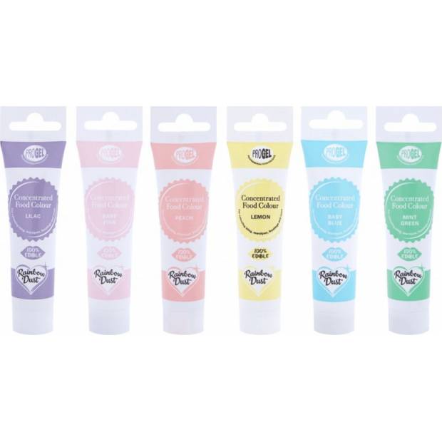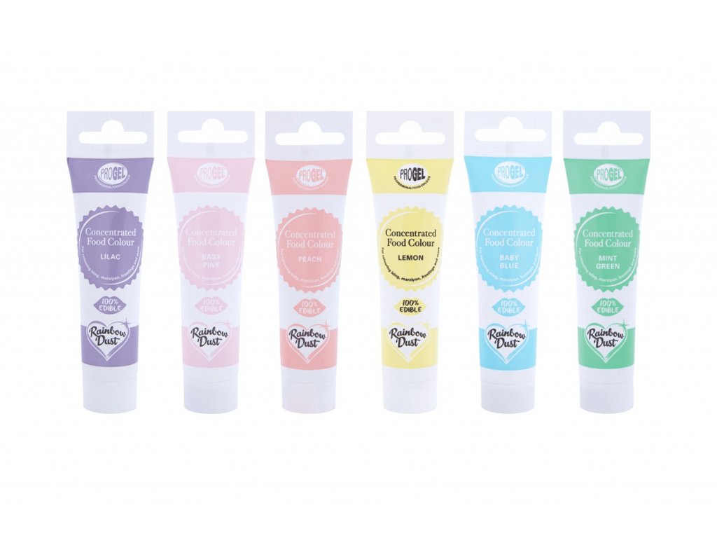 S gelovými barvami Rainbow Dust můžete obarvit svůj fondán, marcipán nebo máslový krém. Stačí malé množství potravinářského barviva, aby vaše výtvory získaly sytou barvu. Trubičky, které déle vydrží, jsou vhodné i k barvení piškotů, bonbonů a dalších. Každý gel je balen v barevně sladěné a čisté plastové tubě. Zkumavky obsahují pod šroubovacím uzávěrem plombu prokazatelnou neoprávněnou manipulaci. Jednoduše odloupněte a vytlačte gel z tuby. Už žádné špinavé nádoby, díky nimž bude vaše skříňka na nářadí plná barevných skvrn. Jak používat: gel přidejte do fondánu nebo marcipánu a hněťte, dokud se barva nespojí. Dobře prohněteme do požadované barvy. Nyní je barevný fondán nebo marcipán připraven k použití na vašem dortu! Doporučené dávkování je 3 gramy na kilogram hotového výrobku.