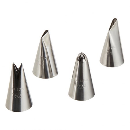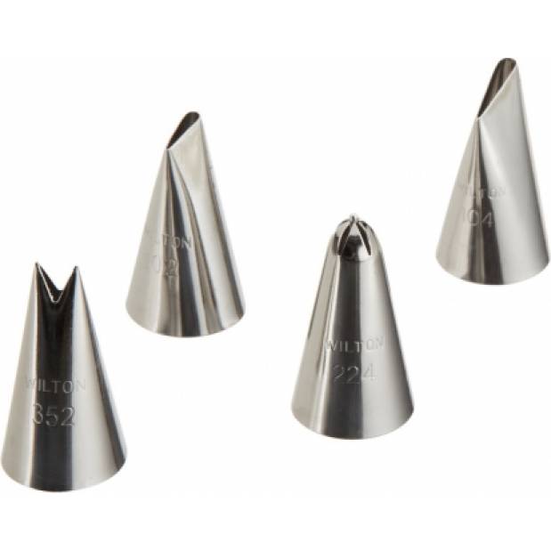 S touto čtyřdílnou sadou hrotů si snadno vytvoříte z krému krásné okvětní lístky, volánky, kapky, mušle a další tvary. Tato sada obsahuje následující tipy: # 102, # 104, # 224, # 352. Jsou vhodné i do myčky nádobí. Fungují se všemi standardními zdobícími sáčky a spojkami.