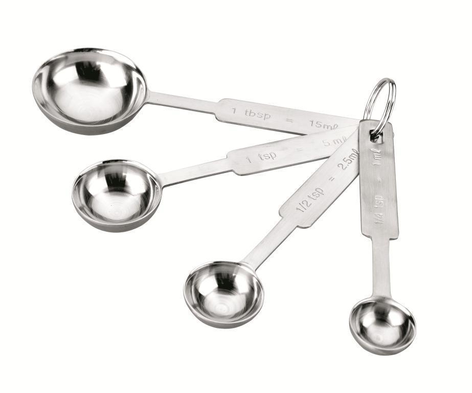 Sada nerezových odměrek s objemem 1 ml, 2,5 ml, 5 ml a 15 ml.