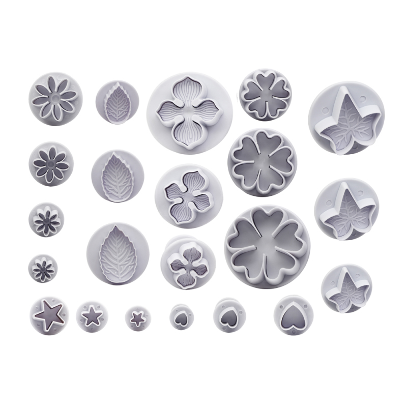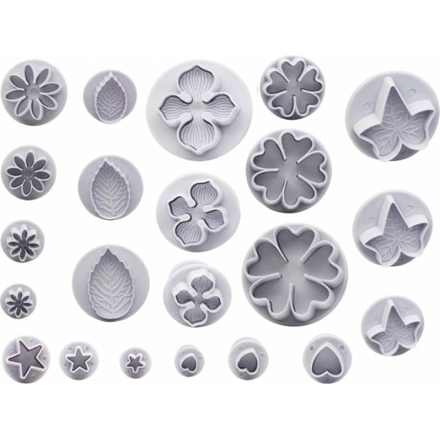 Pístová vykrajovátka jsou skvělou pomůckou pro vytváření přesných tvarů z marcipánu, fondánu nebo gumpasty. Sada obsahuje 22 ks různých listů a květů pro tvorbu jedlých dekorací.