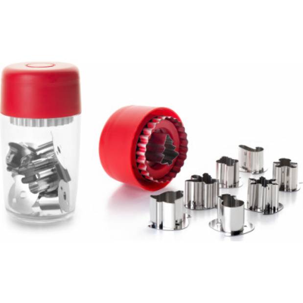 Sada vánočních vykrajovátek o průměru 5 cm s 8 různými vánočními motivy v plastové krabičce.