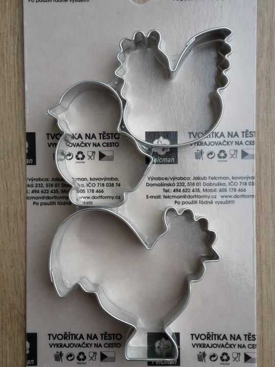 V této velikonoční sadě vykrajovátek najdete motivy slepice, kohout, kuřátko. Vyrobena jsou z kovu. Nevhodné do myčky.