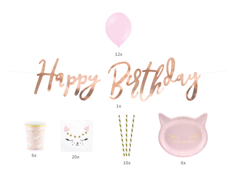 Uspořádejte tu nejlepší párty na světě. Sada dekorací na večírek - Kočka, sada obsahuje: nápis happy Birthday 12x růžový balonek 6x talíř kočička 20x ubrousek 10x papírové brčko zlaté 6x papírový kelímek