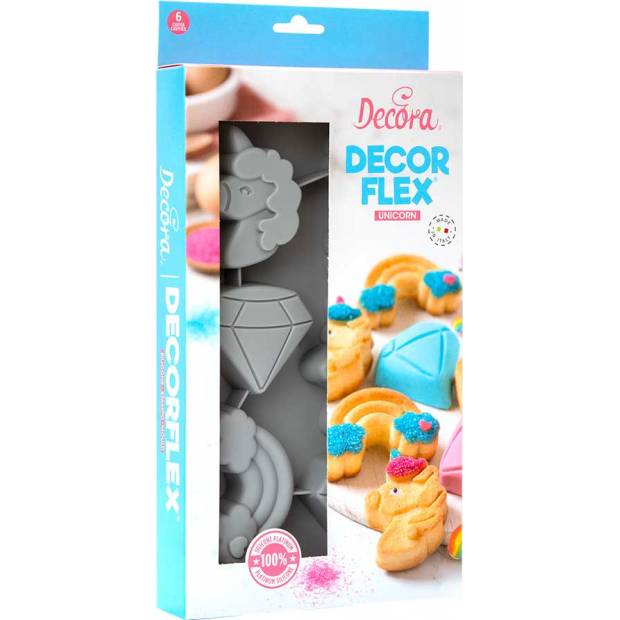 Zde je silikonová forma, ideální pro výrobu sladkého nebo slaného pečiva v troubě nebo v lednici ve tvaru jednorožce, diamantu nebo duhy. Tvary jsou tak detailní, že vaše výtvory lze podávat přímo bez dalšího zdobení. Obsahuje: silikonovou formu se 6 dutinami ve tvaru jednorožce, diamantu a duhy.