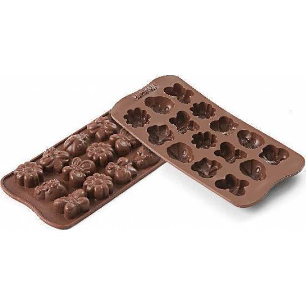 Forma obsahuje čtyři motivy: motýlky, včelky, berušky a květiny. Rozpuštěnou čokoládou naplňte formu, přebytek setřete stěrkou a formou poklepejte o pracovní desku, aby v čokoládě nebyly bublinky. Čokoládky dejte ztuhnout do chladu (forma vydrží teploty do -60°C). Díky nepřilnavosti a pružnosti silikonu bonbonky vždy snadno vyloupnete.
