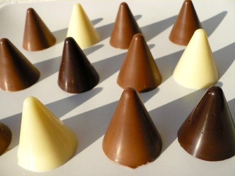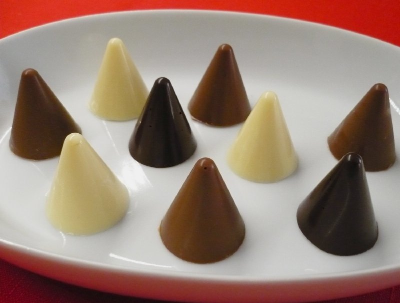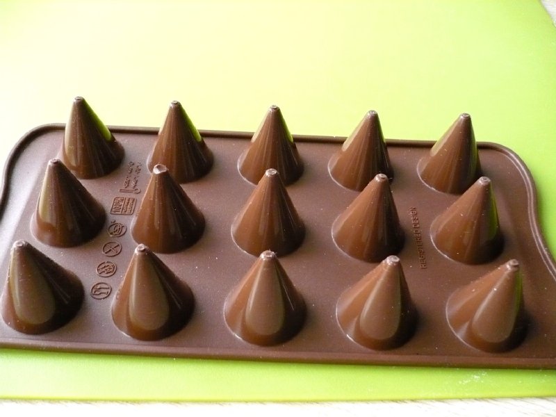 Velice kvalitní silikonová forma na čokoládové kornoutky, které jsem si přejmenovala na kužely. Forma odolává teplotám od -60°C do +230°C a velmi dobře se používá. Na zaplnění jedné formy budeme potřebovat 110 - 115 g čokolády. Čokoládu je třeba před použitím rozpustit a temperovat. K tomuto účelu se báječně hodí hrnec s dvojitými stěnami, mezi které se vlévá voda. Nahradí klasickou vodní lázeň, kde musíme pečlivě hlídat, aby se do čokolády nedostala ani kapka vody nebo pára. Ale dá se se zvýšenou opatrností připravit i tak, někdo k rozpuštění používá mikrovlnnou troubu. Zhruba 2/3 z celkového množství čokolády nasekáme nebo nalámeme na menší kousky a za častého míchání pozvolna rozpustíme při teplotě zhruba 45 °C a odstavíme ze zdroje tepla. Přidáme zbytek na menší kousky nalámané čokolády, necháme ji rozpustit a tím čokoládu temperujeme. Zchlazená by měla mít teplotu od 29°C – 31°C, dle druhu. Bílá čokoláda je připravená k použití při 29°C, mléčná a hořká při 30°C-31°C. Kdo nevlastní teploměr, tak vyzkouší nanést na dolní ret. Čokoláda nemá ani hřát, ale ani studit. Pak formu naplníme, několikrát s ní opatrně „bouchneme“ o desku stolu, tím vypudíme vzduchové bublinky. Povrch zarovnáme jedním tahem např. tvrdší stěrkou a tím i setřeme případnou nadbytečnou čokoládu. Necháme v chladu ztuhnout a kornoutky z formy vyloupneme. Jde to velice lehce. Čokoládky se hodí jak k přímé konzumaci, tak i na ozdobu různých moučníků a dezertů. Za sebe můžu formu jen doporučit. Nejen že se velice dobře používá, ale taktéž udržuje. Je možné ji mýt v myčce nádobí. M.F.