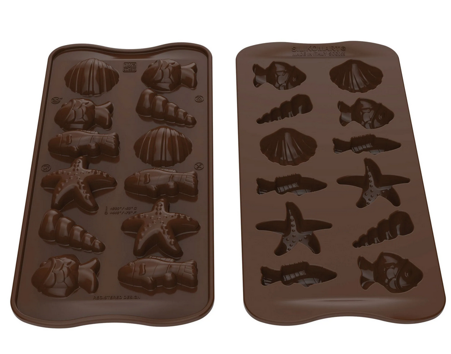 Ponořte se do světa čokoládových výtvorů s formičkou na čokoládu Silikomart podvodního světa. Tato námořní forma na čokoládu vám umožní snadno vykouzlit 12 nádherných mořských čokoládových specialit. S formičkou na pralinky Silikomart 3D Choco vytvoříte 6 ryb, 4 mušle a 2 hvězdice. Staňte se mistrem čokolády a vytvářejte malé sofistikované lahůdky pro chuťové buňky i oko. Připravte malé čokoládky a mini dezerty na tématické dorty. S formičkou na pralinky Easy Choc Choco Underwater World vyrobíte 12 domácích čokolád nebo mini čokoládových dezertů najednou. Univerzálnost Easy Choc’s Molds od profesionálního šéfkuchaře je zaručena pro mrazení i vaření v tradiční troubě nebo mikrovlnné troubě. Ve skutečnosti mohou přenášet teploty od -60 °C až po + 230 °C přímo z mrazáku do trouby. Tyto flexibilní a snadno použitelné formy na výrobu čokolády lze použít až 3000krát, aniž by se staly toxickými. Formičky Easy Choc lze mýt buď horkou vodou, nebo v myčce na nádobí. Vyrobeno v Itálii.