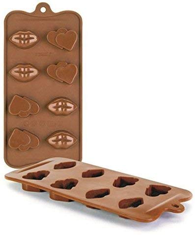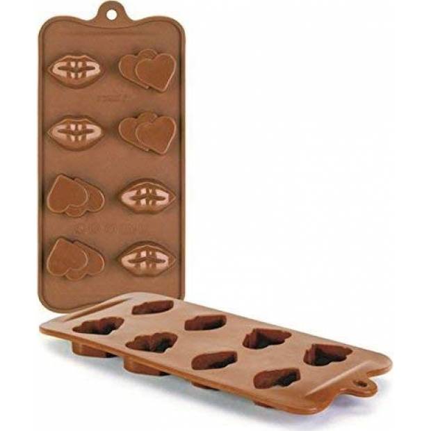 Silikonová forma na výrobu domácí čokolády ve tvaru dvojité srdce a rty. Čokolády se z formy díky použitému materiálu velmi snadno vyklopí. Forma se může použít i na další cukrářské výrobky, snáší teploty od – 60 do + 230° Celsia. Velmi snadno se umývá i v myčce nádobí.Rozměry formy: 10,5 x 21 cm, výška 2,5 cm