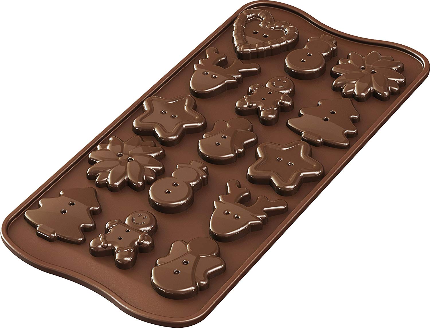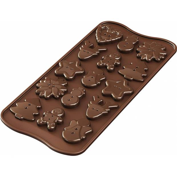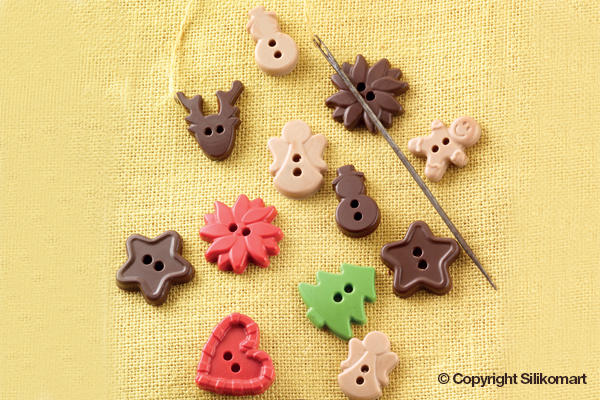 S touto formičkou si můžete vyrobit krásné bonbonky do adventního kalendáře. Obsahuje osm různých tvarů knoflíčků s vánočními motivy (srdíčko, hvězda, sobík, stromeček, andílek, perníček, vánoční hvězda, sněhuláček). Bonbonky snadno vyloupnete, díky nepřilnavosti a pružnosti silikonu. Rozměry bonbonků: 3,5 x 3,5 x 0,6 mm. Objem: 44 ml. Forma na čokoládu se může mýt v myčce.