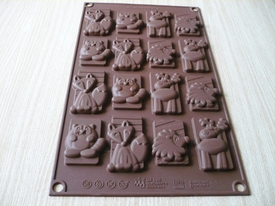 Velmi jsem si oblíbila silikonové formy na čokoládu značky Silikomart. S formami se velmi dobře pracuje a v nabídce jsou v různých tvarech pro každou příležitost. A tak má možnost si vybrat opravdu každý. Vynikají mimořádnou kvalitou a pořízení takovéto formy bude dobrou volbou. Forma snáší teploty od - 60°C do +230°C. Některé formy jsou vhodné na výrobu pralinek, jiné jen na odlévání čokolády. V tomto případě se jedná o formu na odlévání malých čokoládek, s kterými potěšíme hlavně děti.