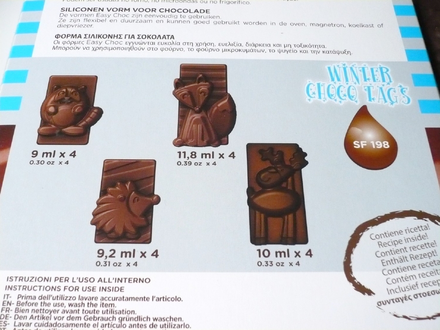 Forma na přípravu šestnácti čokoládových tabulek s motivy soba, lišky, mývala a ježka. Tabulky se zvířátky jsou ideální odměnou do doma vyrobeného adventního kalendáře. V balení kromě formy najdete i brožuru s receptem. Forma je velmi pružná, takže z ní čokoládu vždy snadno vyloupnete.