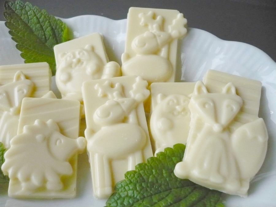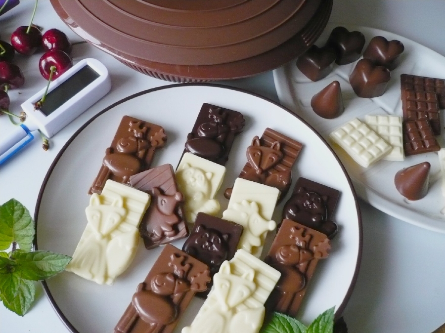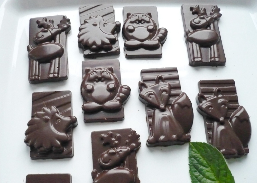 Vytemperovanou čokoládu vlijeme do formy, rozetřeme do všech otvorů a přebytečnou čokoládu setřeme mimo formu. Pracujeme rychle. Nejlépe je mít pod formou pruh papíru na pečení. Nyní formou vícekrát bouchneme o pracovní stůl, abychom vypudili vzduchové bublinky. Případně naplněnou formu položíme na pevnější plastové kuchyňské prkénko a boucháme zespodu. Pak formu odložíme do chladu a necháme čokoládky ztuhnout. Velmi lehce pak jdou z formy vyloupnout.