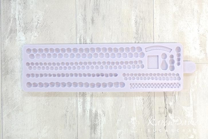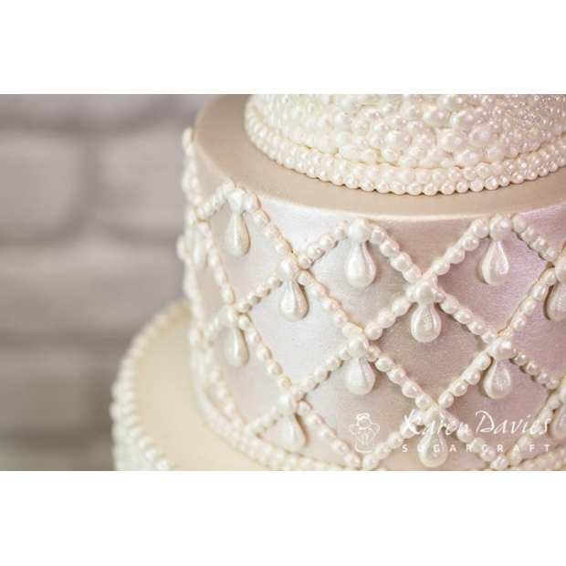 Tato forma na vytváření perel od Karen Daviesové obsahuje šest různých ohraničení perel a tři detaily perel. Ideální pro zdobení (svatebních) dortů. Tato forma se snadno používá a měla by být součástí každé sady nástrojů na zdobení dortů. Forma Karen Davies je flexibilní a je vyrobena z vysoce kvalitního silikonu. Před použitím formu umyjte a důkladně osušte. Velikost perlových okrajů: cca. 1,5 x 16 cm, 1 x 16 cm, 0,5 x 12,5 cm, 0,7 x 13,5 cm, 0,8 x 7,8 cm a 0,6 x 7 cm. Velikost formy: cca. 6,5 x 22 cm.