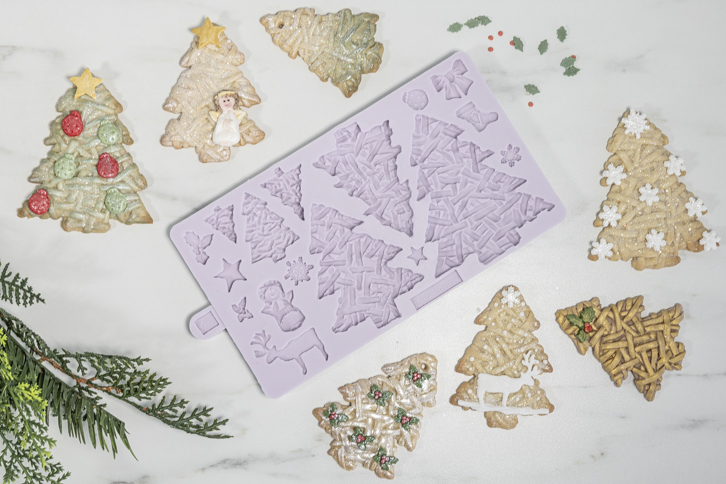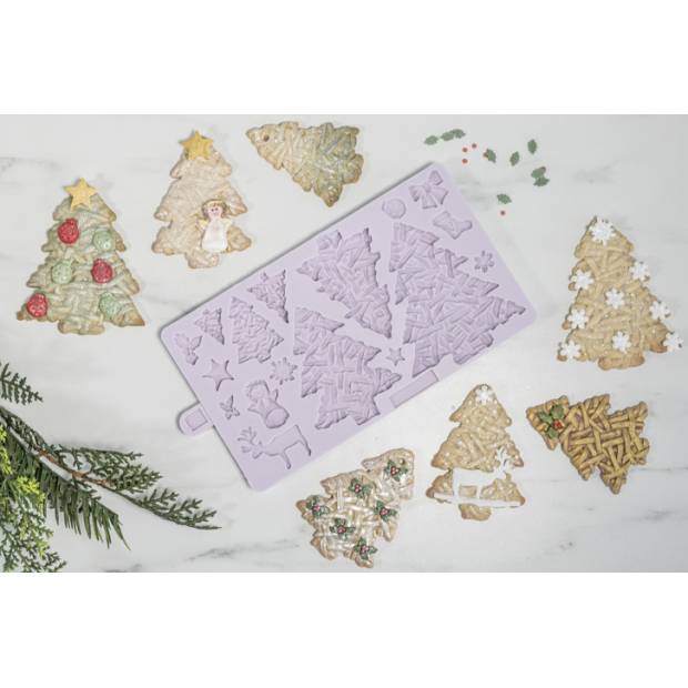 Vytvořte krásné proutěné stromky rychle a snadno pomocí silikonové formy. Forma obsahuje různé velikosti vánočních stromků. K ozdobení košíčků, sušenek a dortů použijte fondán, marcipán, cukrovou pastu, těsto na sušenky a další. Ideální na vánoční večírky a vánoční večeře! Formy Karen Davies jsou detailní, flexibilní a vyrobené z vysoce kvalitního silikonu. Návod: Marcipán nebo fondán dobře prohněteme. V případě potřeby smíchejte fondán s trochou tylo prášku. Udělejte kuličku a marcipán nebo fondán zevnitř ven dobře vtlačte do formy. Poté tvar vyjměte z formy. Pokud je to nutné, poprašte formu předem trochou kukuřičného škrobu, aby se fondán/marcipán snadno dostal z formy. Před použitím formu důkladně omyjte a osušte. Lze použít na cukrovou pastu, květinovou pastu, těsto na sušenky, pečivo, marcipán, modelovací pastu, čokoládu, cukroví, vařený cukr, slané těsto, jíly schnoucí na vzduchu, studený porcelán a embosovací prášek. Rozměr formy: 21 x 12 cm.