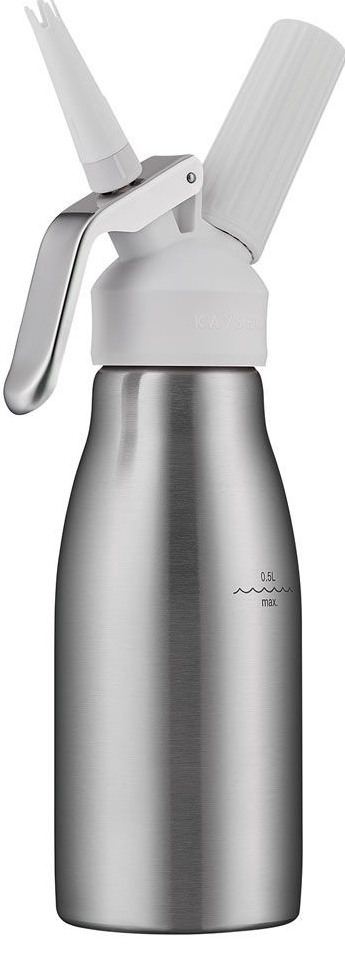 Tato láhev na šlehačku je určena výhradně pro domácí použití. Snadno s její pomocí připravíte ochucenou i klasickou šlehačku, nejrůznější slané pěny, například lososovou. Hotová šlehačka či pěna vám v lednici vydrží čerstvá až po dobu 10 dnů. Šlehačková láhev Style je vyrobena z nerezové oceli, hlava je z tvrzeného plastu. Součástí balení jsou dvě zdobící trysky a kartáček na čištění. Tělo láhve je možné mýt v myčce nádobí. Láhev pořídíte ve variantách 0,25 l a 0,5 l. Výhodou je opravdu snadná obsluha a velmi přesné dávkování. Tento výrobník šlehačky na bombičky je určen pro bezzávitové a jednorázové bombičky.