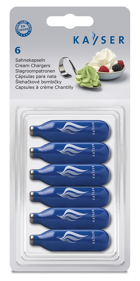 Univerzální bombičky šlehačkové jednorázové jsou vyrobeny v Česku. Jsou vhodné pro tyto modely šlehačkových lahví: Například: Kayser, Tescoma (prodej/model od roku 2017), Liss, Mosa, Hendi, ISI, Orion, Banquet (prodej/model od roku 2019) a dalších značek. Na ušlehání 0,5 l smetany je potřeba pouze 1 bombička. Čistota plynu N2O v bombičce: 99,95 %. Bombičky na šlehačku jsou vyrobeny z recyklovatelné oceli. Tento model je v modré barvě. Nejsou určeny k opakovanému plnění.