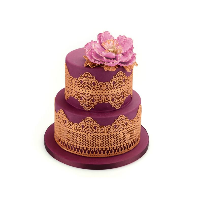 3. Pomocí špachtle rovnoměrně rozetřete hmotu na silikonovou podložku na cake lace. Ujistěte se, že všechny části vzoru jsou vyplněny, poté použijte špachtli a opatrně odstraňte přebytečnou směs.
