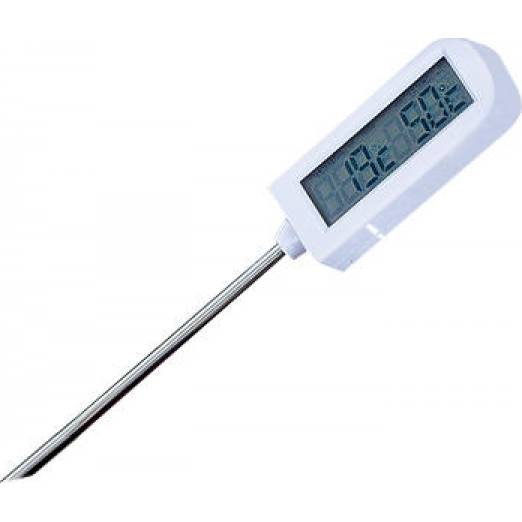 Pokud rádi pracujete s čokoládou, tak teploměr bude patřit k základní výbavě. Přece jen je spolehlivější, než náš odhad teploty temperované čokolády. Jen správně vytemperovaná čokoláda bude mít vlastnosti, které od ní očekáváme. Teplota se liší podle použité čokolády, jiná teplota je u bílé, mléčné a hořké čokolády a proto je teploměr tak důležitý. Určitě bude i dobrým pomocníkem např. při rozpouštění živočišné želatiny, kdy se má teplota pohybovat okolo cca 50°C, při vyšší teplotě by pak želatina neztuhla. Teploměr se dá použít na měření teploty různých pokrmů, všude tam, kde máme dosáhnout určité teploty a nepřekročit ji. Použití je velice univerzální, může sloužit jen ke kontrolnímu měření hotových jídel v teplé kuchyni. Při měření teploty se nemá sonda dotýkat dna. Na teploměru se trvale zobrazuje aktuální teplota a další je nastavitelná. Teploměr má univerzální použití s volitelnou možností zvukového signálu. Sonda je opatřena umělohmotným krytem. Teploměr nám poslouží i jako minutka, kdy odpočítává navolený čas a upozorní zvukovým signálem.