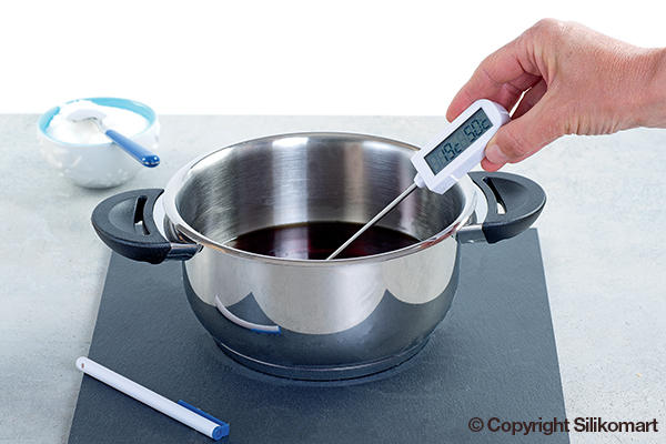 Digitální teploměr měří od -50°C do 300°C. Teploměr má praktickou funkci nastavení teploty. Jakmile tak čokoláda při temperování dosáhne požadované teploty teploměr zapípá. Při vaření můžete teploměr zavěsit za okraj hrnce. Nevkládejte do přímého ohně.