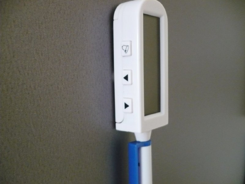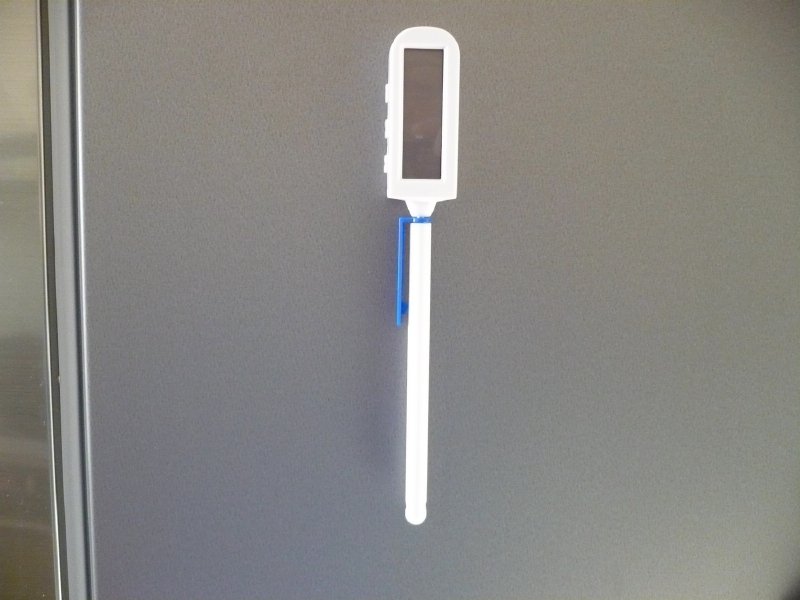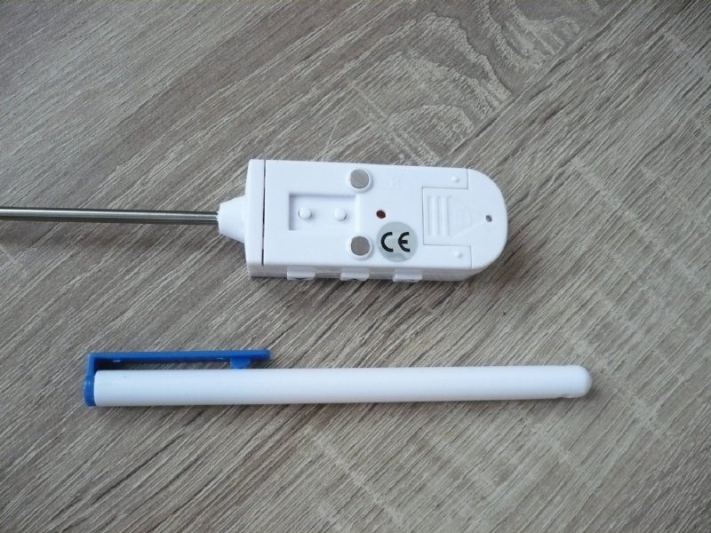 Délka celého teploměru je 20 cm, samotné sondy 13 cm. Na zadní straně se zapíná a vypíná tlačítkem ON – OFF, tlačítkem MODE se zvolí buď funkce měření teploty, nebo timer (minutka) -odpočítávání času k nule. Teploměr má na zadní straně dva malé kulaté magnety a proto ho můžeme přichytit i dovnitř hlubšího hrnce nebo jiné vhodné nádoby. Tímto způsobem můžeme teploměr odložit kdekoliv, třeba i na chladničku apd. Na boční straně jsou dvě ovládací tlačítka pro nastavení teploty nebo pro nastavení času, dle zvolené funkce. Čas lze navolit v sekundách, minutách i hodinách. Přidržením tlačítka se jak čas, tak i teplota rychleji načítají. Třetí tlačítko slouží k zapnutí a vypnutí zvukového signálu při nastavené teplotě, nebo se tímto tlačítkem spustí nebo naopak stopne minutka.