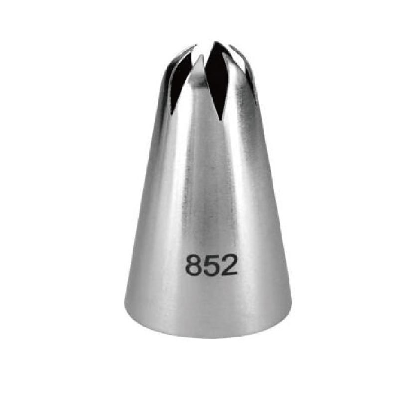 Tyto cukrářské špičky pod číslem 852 tvoří tvar hvězdy. Jsou nezbytné v každé kuchyni dekoratérů dortů, vám umožní vytvořit vše od máslových vírů a okrajů skořápek až po šlehačkové růžice, víry květiny s přímou kapkou, tvrzené květiny z královské polevy a samozřejmě hvězdy. Různé velikosti usnadňují přizpůsobení vašich návrhů rozsahu vaší tvorby. Tipy v profesionální kvalitě na zdobení dortů, cukroví a pečiva. Precizně vyrobené z nerezové oceli pro výjimečnou odolnost/záruku životnosti. Čím větší je číslo hrotu, tím větší je otvor. Používejte s máslovým krémem, královskou polevou, šlehačkou a dalšími. Pro lepší kontrolu, všestrannost a úhlednost použijte hroty s odpovídající spojkou (prodává se samostatně). Spojka umožňuje dekoratérovi měnit tuby podobné velikosti bez vyprázdnění obsahu cukrářského sáčku.