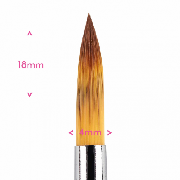 Špičatý štětec č.4 má úzkou špičku s dlouhými těsně uspořádanými štětinami. Je ideální pro jemnější detaily včetně tahů, nápisů, obrysů, jemných souvislých tahů a retuše. Má měkké syntetické štětiny.