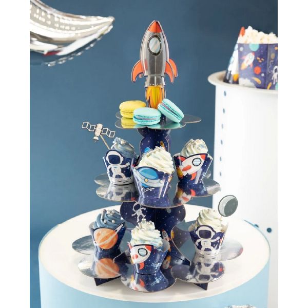 Stojan na cupcaky je skvělý nápad na praktickou dekoraci stolu, zvláště když vypadá jako vesmírná raketa. Na ní umístěné muffiny vytvoří kompozici, kterou budete chtít jíst i očima. A pohled na živé barvy přitáhne pozornost malých účastníků večírku a vykouzlí jim úsměv na tváři.