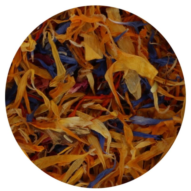 okvětní lístky růží (sušené), květy měsíčku (sušené), chrpa (sušené), světlice barvířská (sušená).