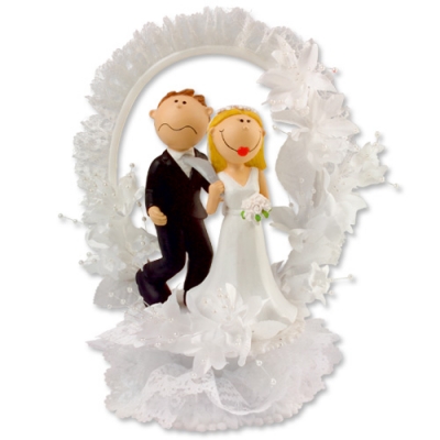 Nejedlá dekorace v podobě legračního svatebního páru, který je postaven na pevné základně. Nevěsta s ženichem jsou skvělou dekorací na jakýkoliv dort. Figurka působí velmi romantickým dojmem. Rozměry sošky jsou 180 x 220 mm. Sošku lze použít na svatební dort patrový, atypický i na zcela jednoduchý. Není potřeba žádná složitá příprava. Díky pevné základně bude držet přesně na svém místě. Soška je vyrobena z odolného plastu a bílého tylu.