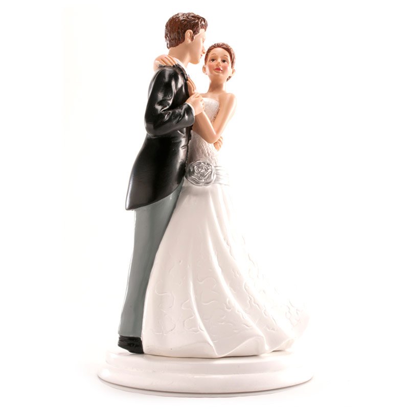 Elegantní sváteční ozdoba je ideální pro zdobení svatebních dortů. Svatební figurka je jednoduché a elegantní řešení pro zdobení dortů. Hlavními postavami této dekorativní figurky vyrobené z pryskyřice jsou novomanželé při svém prvním tanci. Vyznačuje se spontánním, zábavným a elegantním stylem. Splňuje všechny požadavky evropských norem a je vhodná pro styk s potravinami. Výrobek je vhodný pro profesionální použití v cukrárnách. Tato nejedlá dekorace se dá využívat opakovaně, můžete si ji schovat jako vzpomínku na váš svatební den. Výška 16 cm.