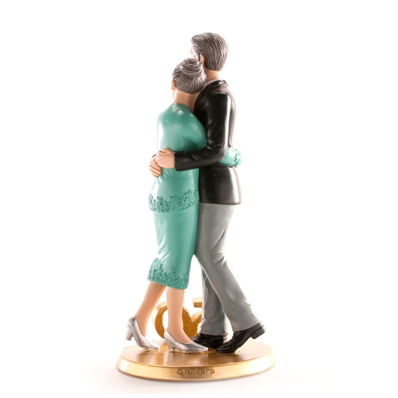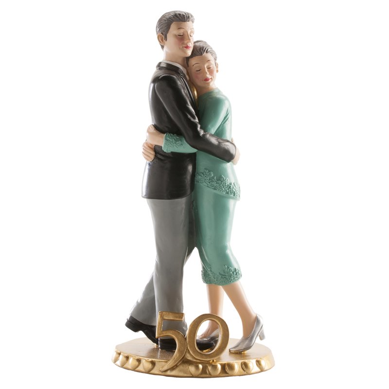 Elegantní sváteční ozdoba je ideální pro zdobení svatebních dortů k výročí zlaté svatby. Svatební figurka je jednoduché a elegantní řešení pro zdobení dortů. Hlavními postavami této dekorativní figurky vyrobené z pryskyřice jsou manželé, kteří slaví zlatou svatbu, v objetí. Na spodní části je vyznačená číslice 50 Vyznačuje se spontánním, zábavným a elegantním stylem. Splňuje všechny požadavky evropských norem a je vhodná pro styk s potravinami. Výrobek je vhodný pro profesionální použití v cukrárnách. Tato nejedlá dekorace se dá využívat opakovaně, můžete si ji schovat jako vzpomínku na váš svatební den. Výška 19 cm.
