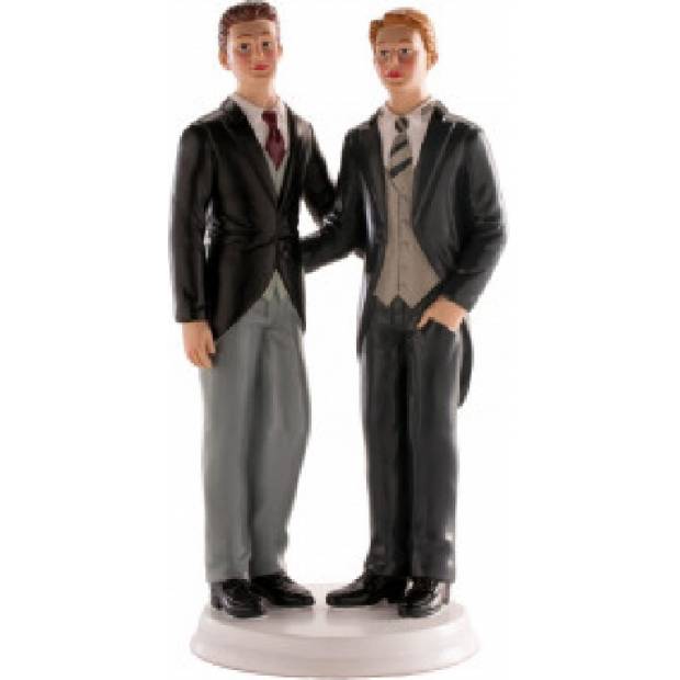 Ideální figurka pro zdobení svatebního dortu pro gay svatbu. Tento topper představuje pár elegantně oblečených mužů: tmavovlasý muž nosí šedý a černý oblek, zatímco světlovlasý nosí klasický smoking. Tato svatební figurka splňuje všechny požadavky evropských norem a je vhodná pro styk s potravinami. Výrobek je vhodný pro profesionální použití v cukrárnách. Tato nejedlá dekorace se dá využívat opakovaně, můžete si ji schovat jako vzpomínku na váš svatební den. Vyrobena je z pryskyřice. Výška 19 cm.
