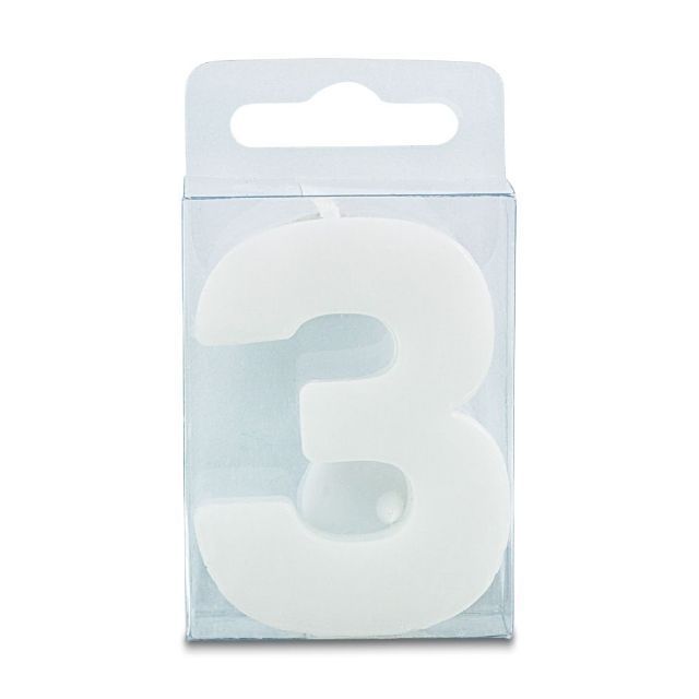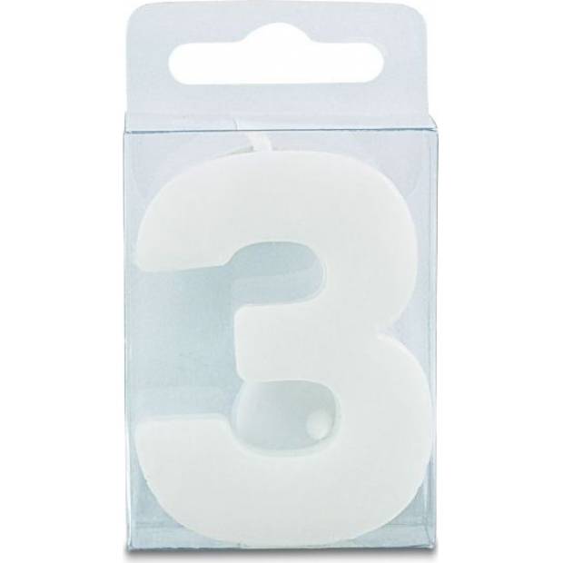 Svíčka ve tvaru číslice 3, výška 4 cm, bílá. Je vhodná především na narozeninový dort a zdobení podobných moučníků. Svíčka zcela splňuje všechny bezpečnostní předpisy.