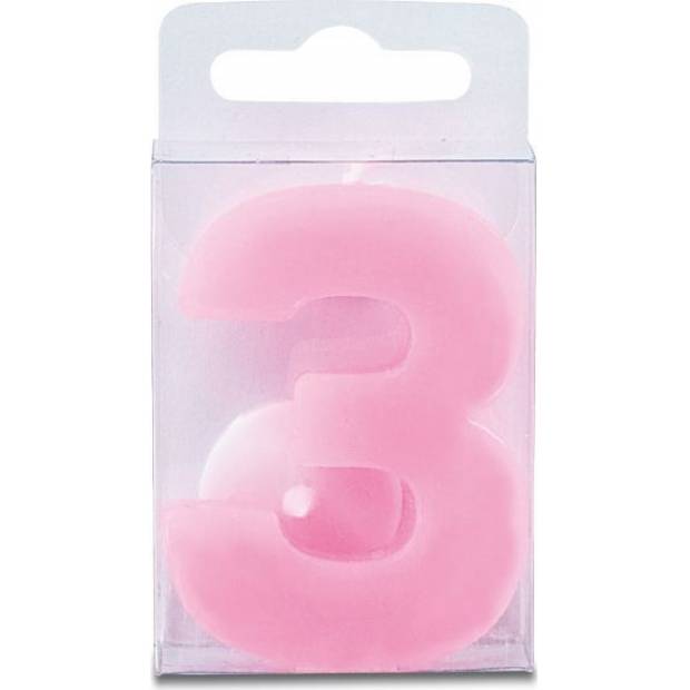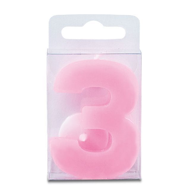 Svíčka ve tvaru číslice 3, růžová barva, výška 4 cm. Je vhodná především pro zdobení narozeninového dortu a podobných moučníků. Svíčka splňuje všechny bezpečnostní předpisy.
