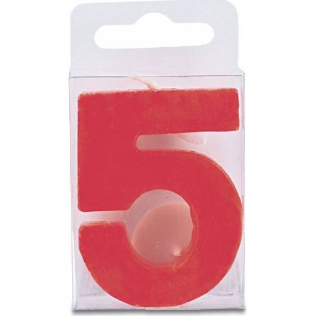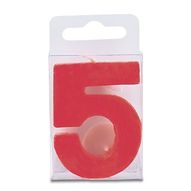 Svíčka ve tvaru číslice 5, výška 4 cm, červená barva. Je vhodná především na narozeninový dort a zdobení podobných moučníků. Svíčka splňuje všechny bezpečnostní předpisy.