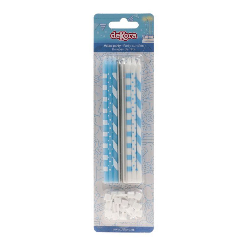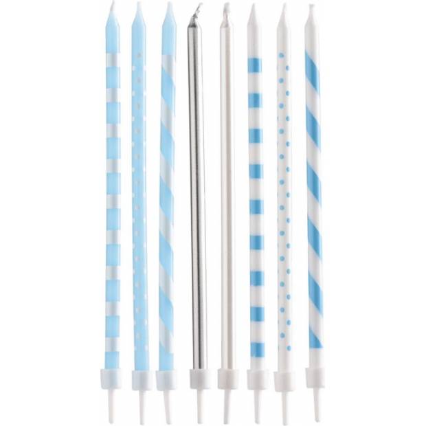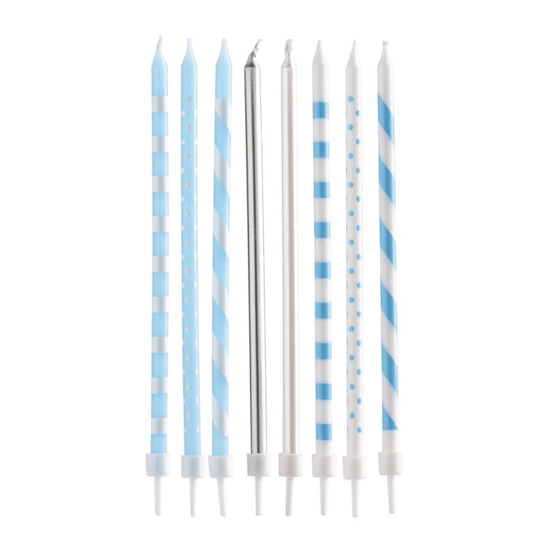 Modré, bílé a stříbrné svíčky, ideální pro zdobení narozeninového dortu. Balení obsahuje 16 svíček a 16 držáků. Výška svíčky je 13 cm.