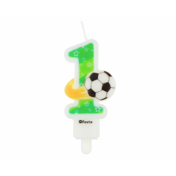 Bílá svíčka ve tvaru číslice je na přední straně pokryta zelenou barvou s potiskem hvězdiček. Navíc jej zdobí potisk vypouklého fotbalového míče s ohnivou září. Svíčka je připevněna k narozeninovému dortu na plastovém stojánku. Doplněno dalšími číslicemi vytváří libovolné číslo.Výborná dekorace dortu pro zdůraznění jedinečnosti a následných narozenin sportovního fanouška, zejména fotbalu.