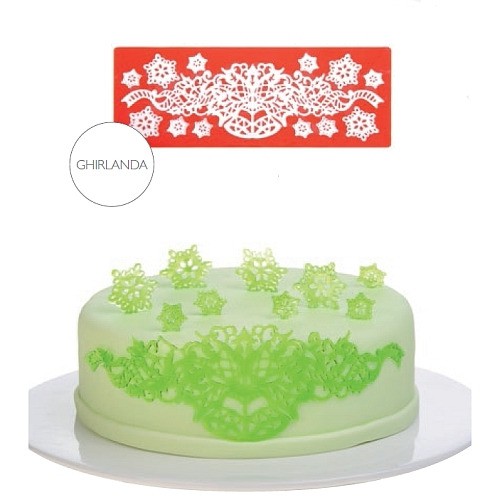 "Forma ze silikonu na přípravu jedlé krajky v podobě girlandy. Jedlá krajka se používá na dekorace a zdobení dortů, rolád, zákusků, většího cukroví… Vyrábí se velmi snadno. Do silikonové formy se natře jedlá hmota, která je po zaschnutí vláčná a po vyjmutí z formy je ji možné různě podle potřeby tvarovat. Hmoty jsou připravené barevné, mohou se ale obarvit i před vložením do formy nebo i po vyjmutí z forem.