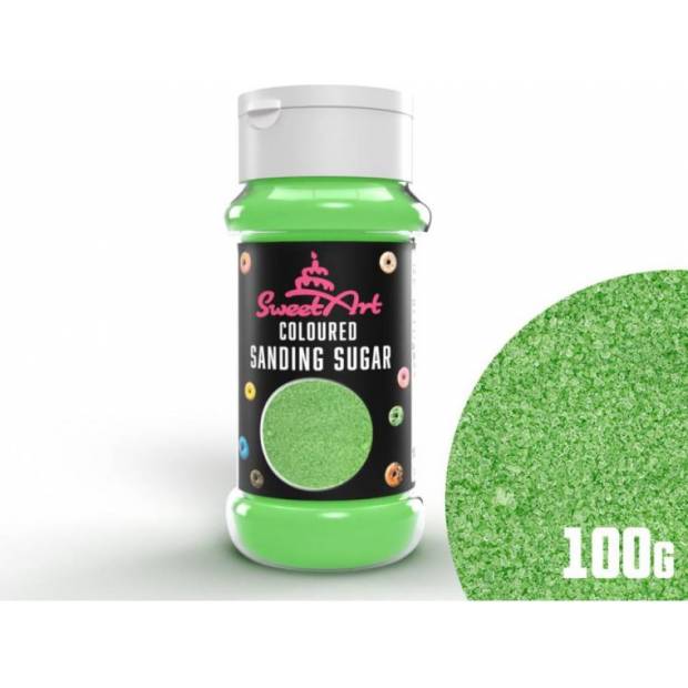 Světle zelený dekorační cukr SweetArt. Dokonalý, jedinečný povrch pro domácí pečivo. Použijte jej ke zdobení cupcaků, dortů, koblih, sušenek, dezertů, perníků, zmrzliny, dortů a mnoha dalších dezertů. Dá se použít i jako dekorace na nápoje. Praktická nádobka pro snadné dávkování.