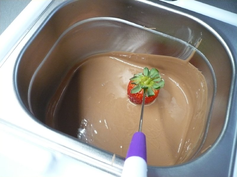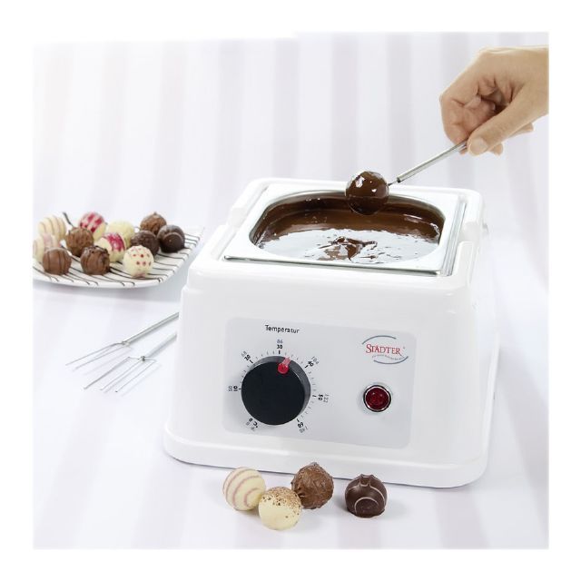 "Temperovací přístroj na rozpuštění a ohřev čokolády na 60 ° C. Přístroj je vybavený odnímatelnou nádobou z nerezové oceli a víkem. Nádoba s čokoládou se zahřeje na dně a bocích, aby byla zajištěna rovnoměrná teplota. Regulace teploty probíhá za pomoci termostatu 230V / 80W, je plynule nastavitelná až do 60 ° C. Kapacita nádoby je 1,5 l. Nádobu i víko lze mýt v myčce nádobí. Temperovací přístroj na čokoládu najde uplatnění při všech větších rodinných nebo dětských oslavách.