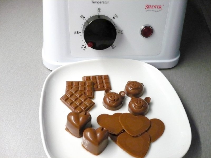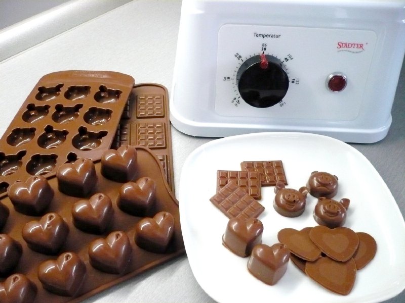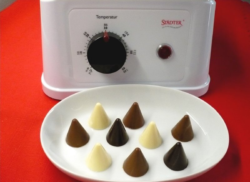 Tento přístroj usnadní práci všem, kteří čokoládu používají na výrobu různých pralinek, na polévaní dortů a jiných moučníků, při přípravě cukroví a třeba namáčení ovoce, včetně toho sušeného. Věřím, že budete s přístrojem spokojeni, tak jako já. V eshopu jsou v nabídce i kvalitní teploměry určené pro práci s čokoládou a taktéž různé nástroje, jako napichovátka, očka a vidličky. Pro ty z Vás, kteří pracujete s menším množstvím čokolády, tak je v nabídce temperovací přístroj menší velikosti. M.F.