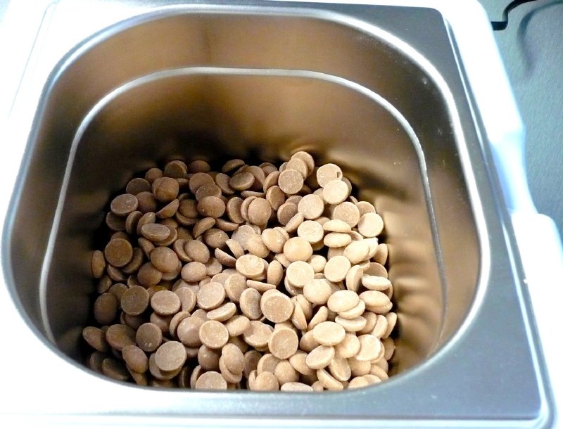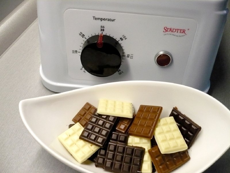 Do nádoby přístroje vložíme zhruba dvě třetiny čokolády z celkového množství, nejraději ve tvaru čoček. Jinak je třeba čokoládu nalámat nebo nasekat na malé kousky. Přikryjeme víkem a nastavíme teplotu na 45°- 50°C. Rozpuštěná čokoláda by měla dosahovat maximálně teploty 45°C. Proces kontrolujeme teploměrem. Při rozpouštění občas zamícháme. Doba rozpuštění závisí na celkovém množství čokolády. Pak na přístroji nastavíme teplotu dle použitého druhu čokolády. U bílé čokolády to je 28–29°C, u mléčné 30-31°C a u hořké 31-32°C. Nádobu vyjmeme z přístroje a rozpuštěnou čokoládu rychle zchladíme – temperujeme, přidáním další čokolády. Stále mícháme až do rozpuštění, teplotu kontrolujeme teploměrem. Čokoládu přidáváme po částech a vždy dobře vymícháme, až do dosažení potřebné teploty dle druhu. Nádobu vložíme zpět do přístroje, který nám bude požadovanou teplotu udržovat a můžeme s čokoládou začít pracovat.
