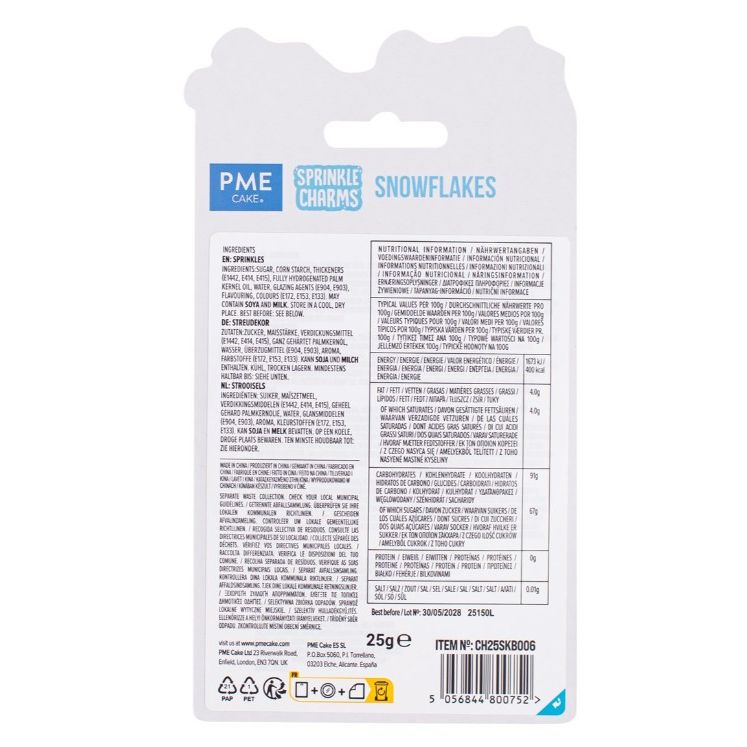 Tyhle dekorace ve tvaru sněhových vloček od PME udělají z tvých vánočních dezertů doslova zimní pohádku. V balení najdeš 25 g větších cukrových vloček v odstínech bílé, stříbrné a jemně modré – přesně ty barvy, které na zimních dortech a cupcakes vypadají nejkrásněji.