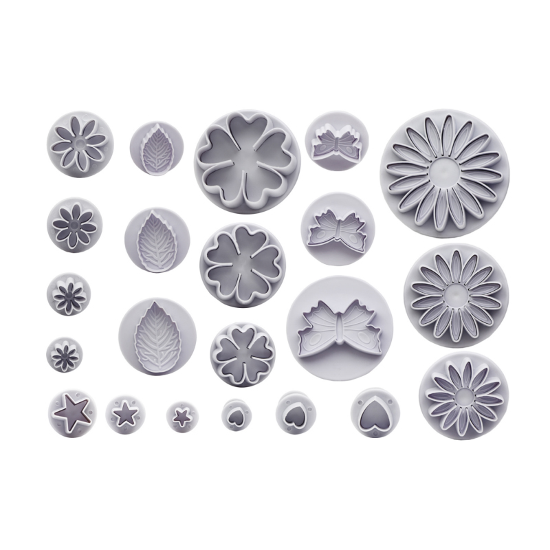 Pístová vykrajovátka jsou skvělou pomůckou pro vytváření přesných tvarů z marcipánu, fondánu nebo gumpasty. Sada obsahuje motýla, listy a květy. Velmi dobře se s nimi pracuje.