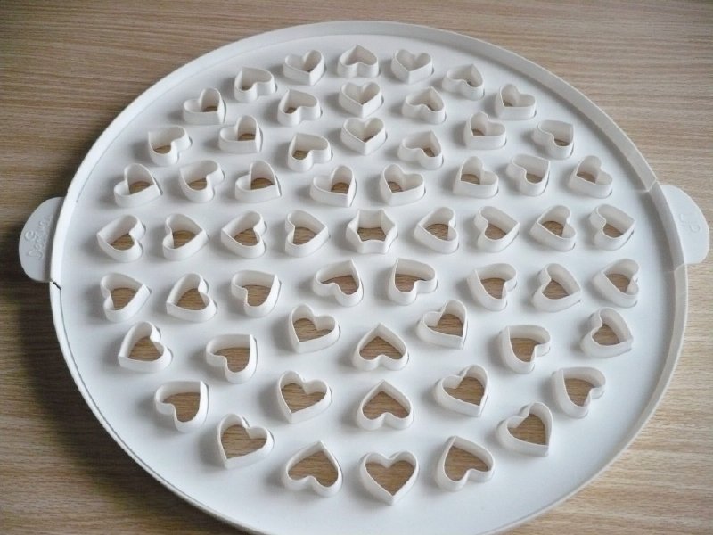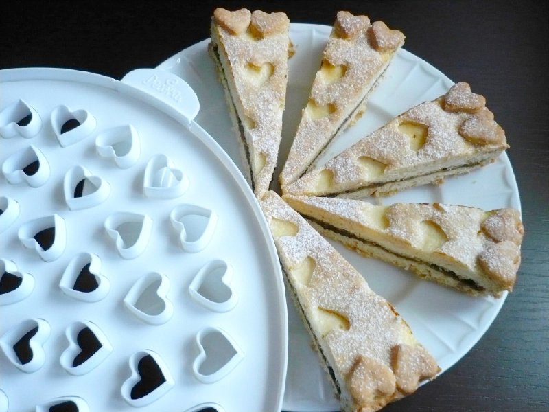 Vykrajovací forma z tvrdého plastu se skládá ze dvou dílů. Jeden díl slouží k vykrojení těsta ve tvaru malých srdíček a druhý pak slouží jako podložka k lehkému přenášení na moučník. Tento díl má úchyty a moc dobře se s ním manipuluje. Forma se může použít na koláče o průměru 30 cm a menší. S formou se moc dobře pracuje, vyzkoušela jsem ji při přípravě sladkých koláčů z lineckého, křehkého a tvarohového těsta. Připravené těsto se nechává zabalené ve fólii odležet v chladu. Může se připravit jak světlé, tak i tmavé, s ořechy atp. Na obalu produktu je fotonávod a zde se můžete podívat i na video postupu přípravy.