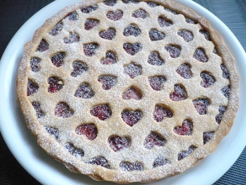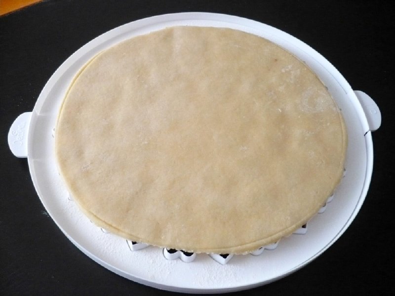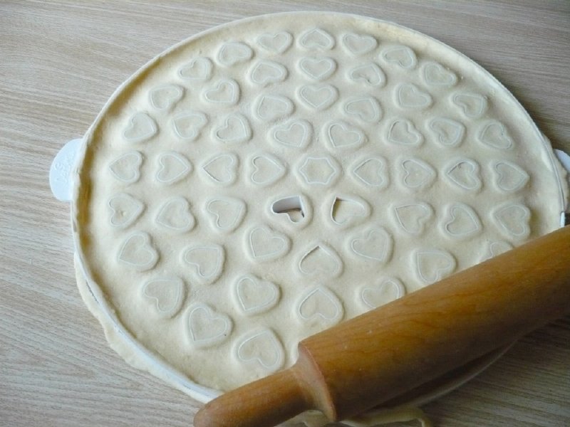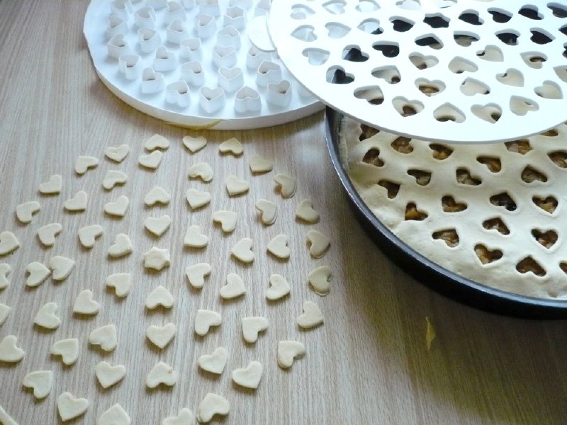Jako první se oba díly správným způsobem zasunou do sebe. Dolů patří vykrajovací forma a na ni se přidá druhý díl sloužící pak jako podložka k přenášení. Přes menší cedník se shora lehce popráší hladkou moukou a položí se vyválené těsto o žádaném průměru dle koláčové formy. Na povrch koláče stačí vyválet menší polovinu z připraveného těsta. Pracujeme se studeným těstem, jinak pak na formě položené těsto odložíme na chvíli do chladu. Alespoň mně se to osvědčilo. Větší polovinu těsta taktéž rozválíme do kruhu, vyložíme jím velmi lehce tukem vymazanou koláčovou formu a uděláme vyvýšené okraje. Přidáme jakoukoliv náplň a tu na povrchu uhladíme. Můžeme použít třeba jen marmeládu, jablečnou náplň nebo jinou ovocnou, tvarohovou, makovou, hustý pudink atp. Když máme vše takto připraveno, vyjmeme z chladu vykrajovací formu s vyváleným těstem nahoře a po těstě důkladně přejedeme delším válečkem, třeba vícekrát. Tím nám vzniknou srdíčkové otvory. Za pomocí úchytů nadzvedneme horní podložku s těstem a těsto z podložky přesuneme na připravený koláč. Pak upravíme okraje, třeba je lehce přetřeme malým štětečkem vodou a použijeme na vytvarování okraje vykrojená srdíčka. Díky malému množství vody se přilepí a neodpadávají. Nebo vykrojená srdíčka zpracujeme do koule a vyválíme do dlouhého válečku a tím okraj začistíme, ale lépe vypadají srdíčka. Připravený koláč vložíme do předehřáté trouby a upečeme.