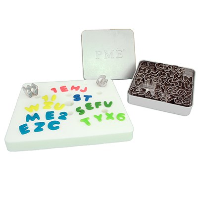 Vykrajovátka s pístem představují kompletní abecedu. Vytvořit tak můžete libovolná slova z marcipá